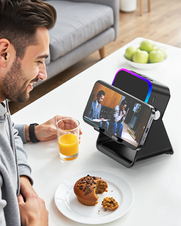 3500 mAh Rechargeable & Compact and Portable:The phone speaker has a built-in 3500 mAh Rechargeable, which can charge your phone while listening to music or watching movies. bluetooth speaker with stand is small and portable, very suitable for outdoor, party, travel, etc