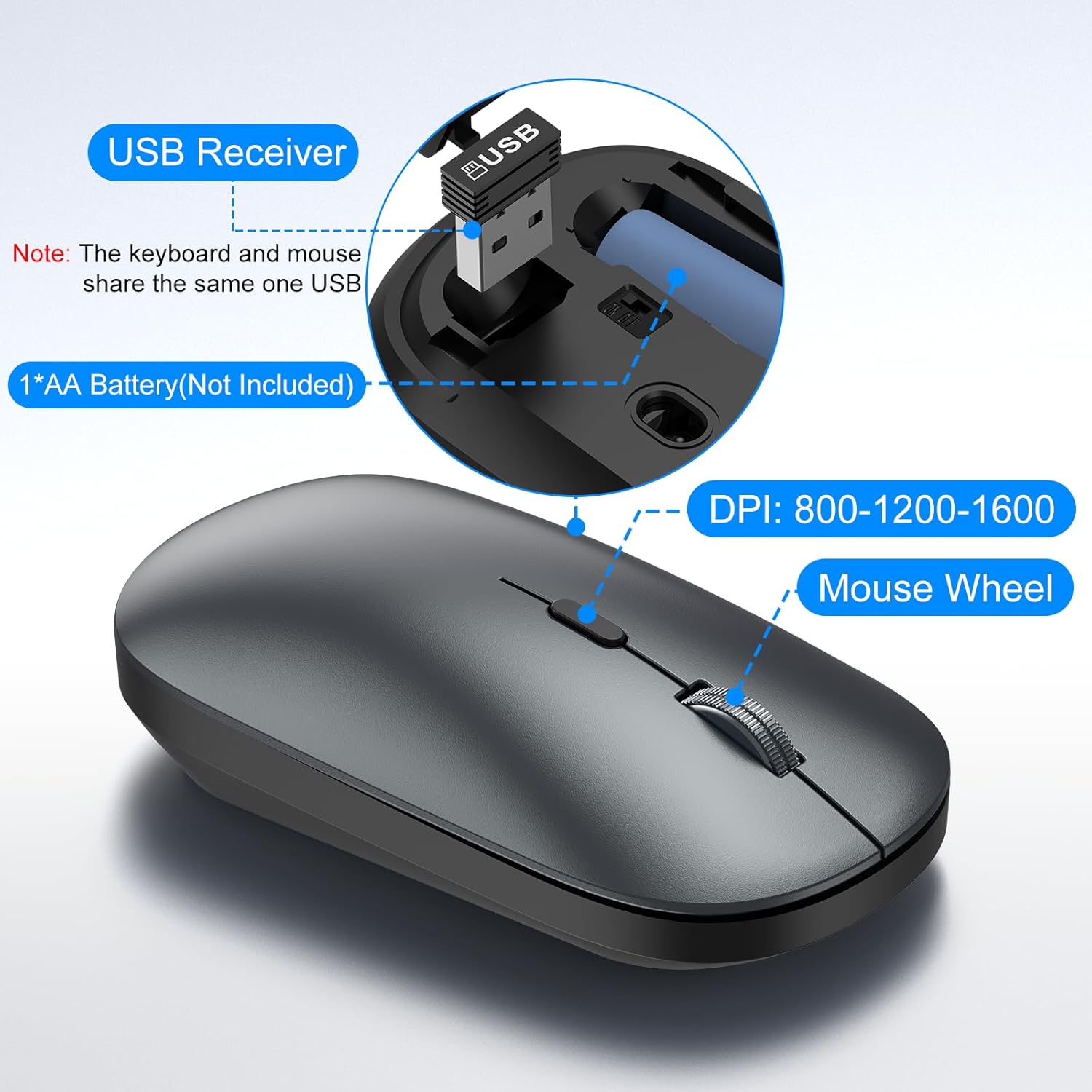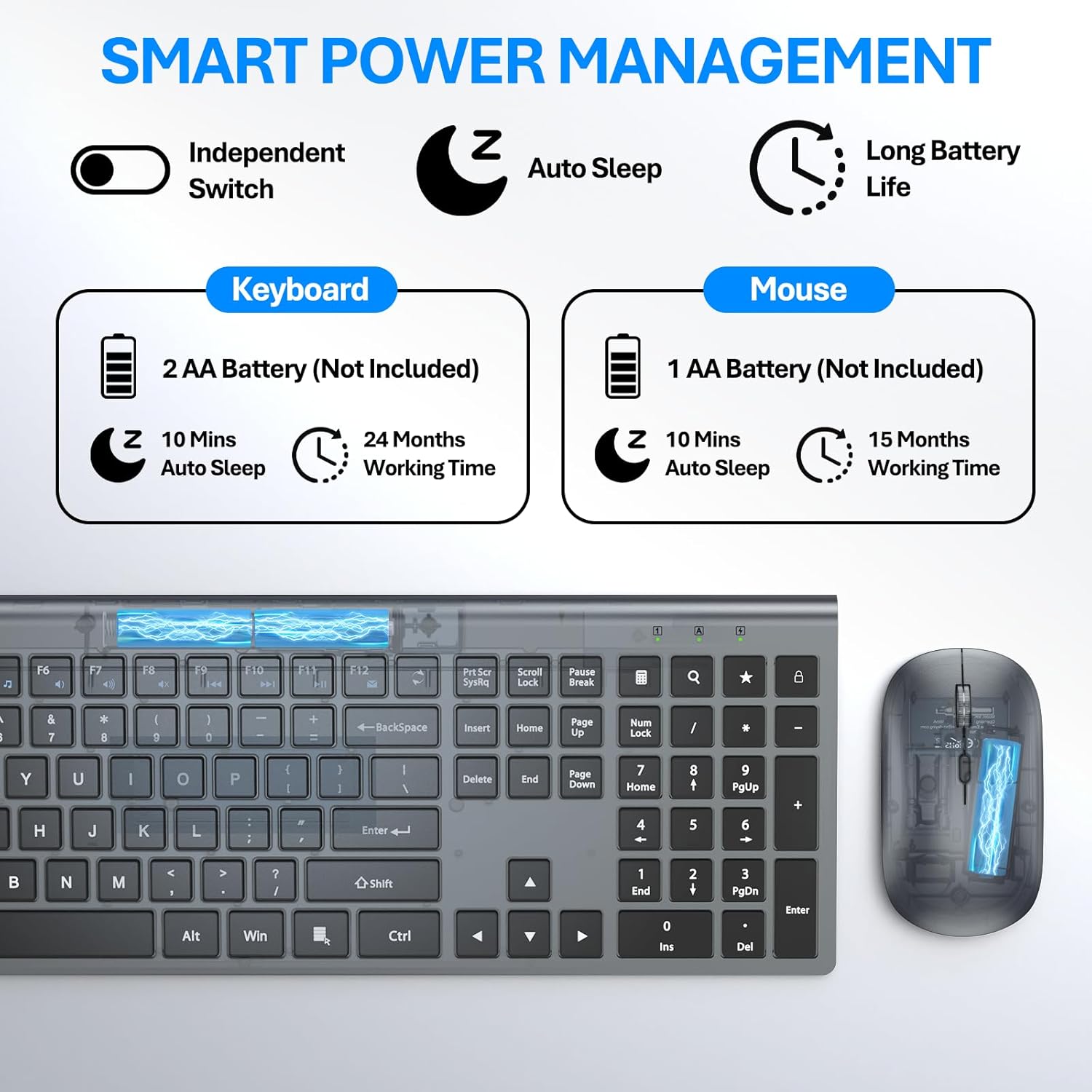 ENERGY SAVING & DURABILITY : The wireless mouse and keyboard features with smart sleep mode for saving power. Idle for 10 mins, the keyboard and mouse will sleep mode, press any button or key to wake up. You can go for months without the hassle of changing the batteries. The keyboard needs 2 x AA batteries, the mouse needs 1 x AA battery. (Battery Not Included)