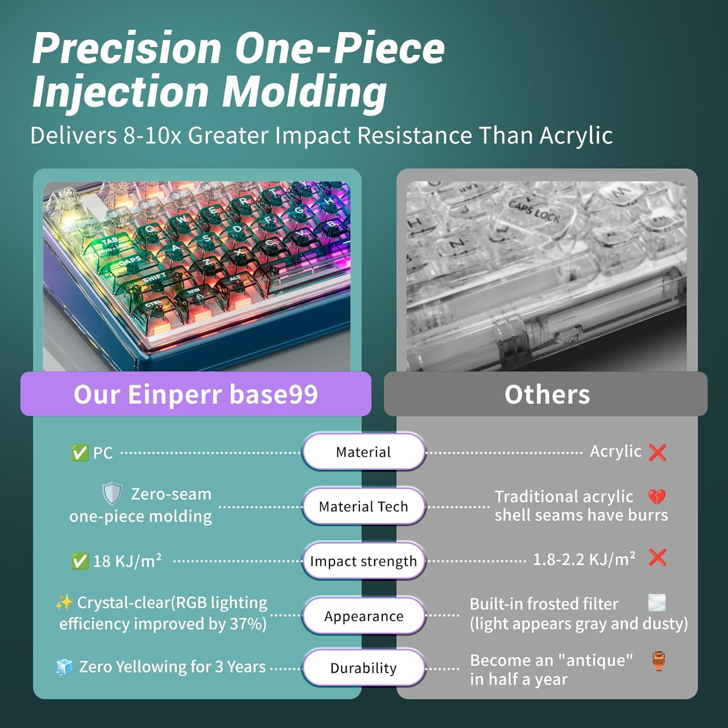💎 Premium Crystal-Clear Durability – Crafted from high-transparency PC via precision one-piece injection molding, Base99 mechanical keyboard stays shining and delivers 8-10x greater impact resistance than acrylic. The polished, non-frosted finish ensures breathtakingly vibrant colors and lighting.