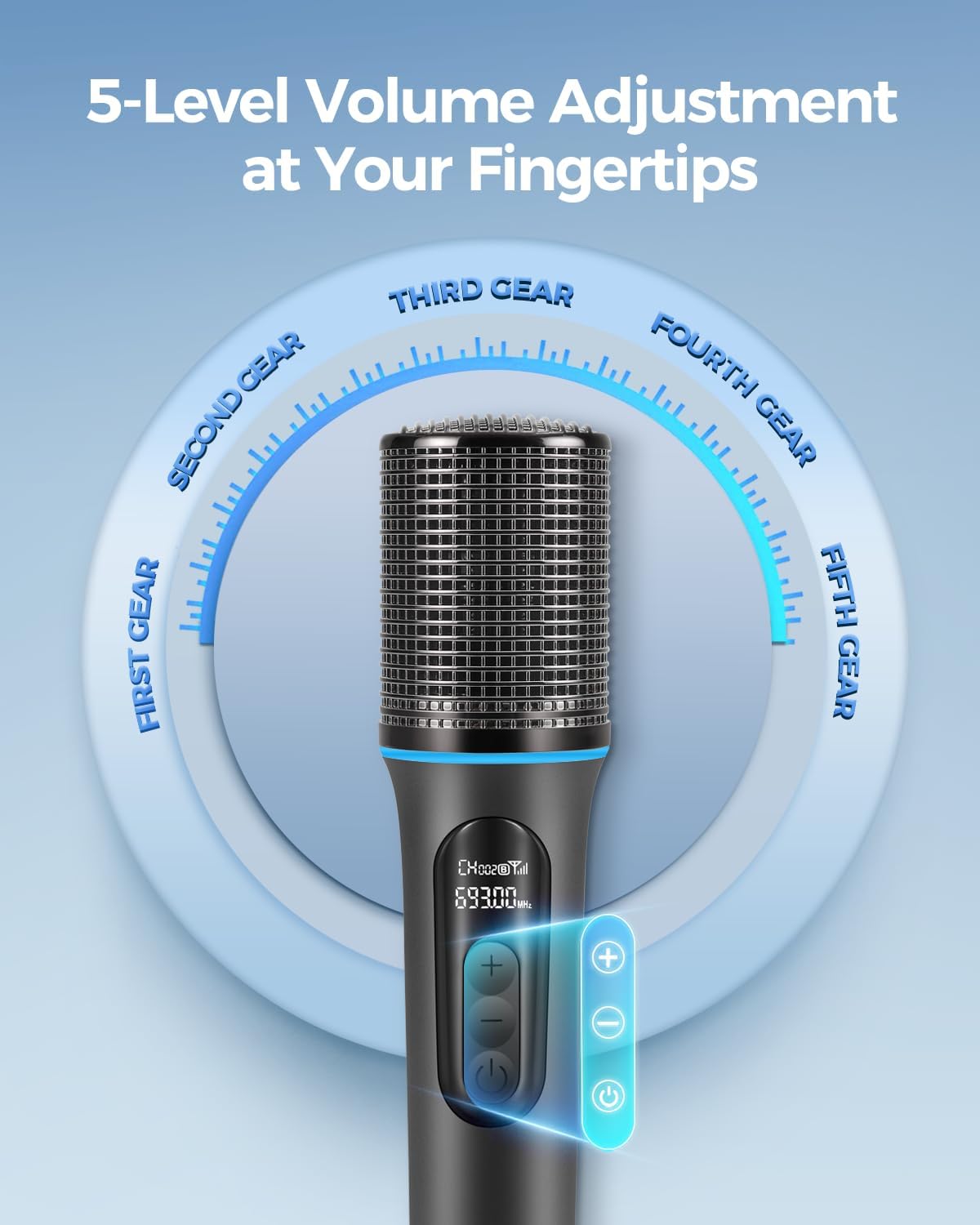 [Upgraded Features] The upgraded microphone features a 5-level volume control system with physical buttons, eliminating the need to switch devices and enabling real-time gain adjustments directly from the microphone body. Innovatively integrated dynamic RGB lighting module pulses in sync with musical beats, adding vivid energy to every singing session.