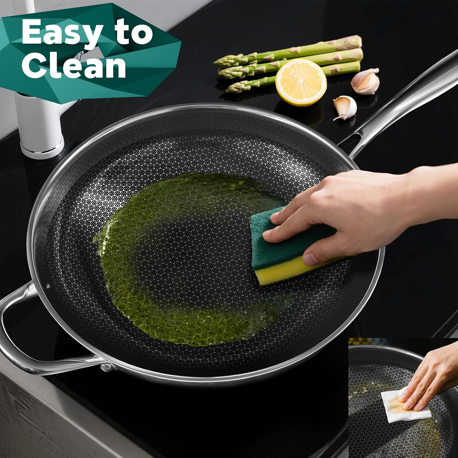 【Advanced Nonstick Tech | PFOA-Free & Healthy】Features innovative laser-etching that creates a precise raised pattern on this premium stainless steel wok. This 0.3mm deep physical barrier reduces sticking by 50%, providing superior food release without harmful chemicals. Requires minimal oil for healthier cooking—100% free from PFOA/PFAS/PTFE. Enjoy exceptional durability and effortless cleaning for stir-fries, meats without scraping. Engineered for a lifetime of healthy cooking.