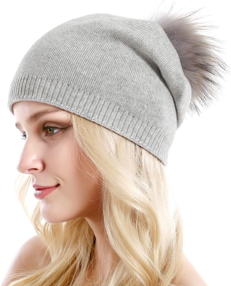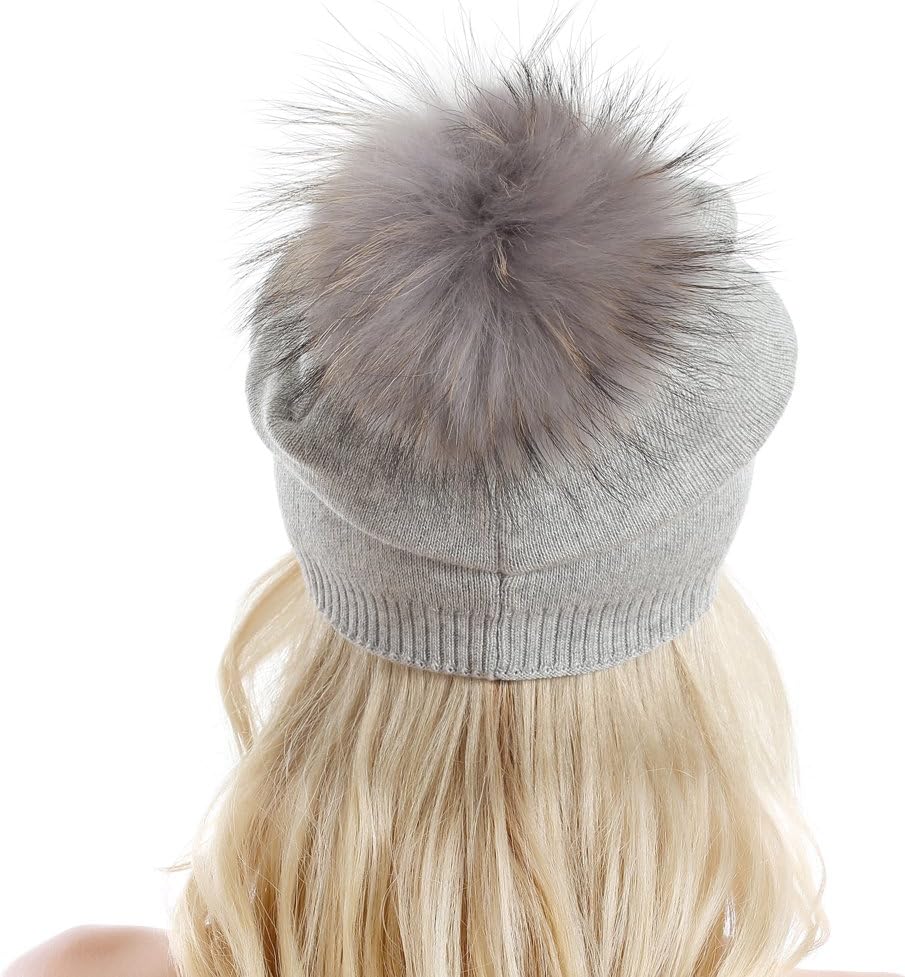 Women Knit Wool Beanie – Winter Fashion Solid Wool Hats Real Removable Raccoon Fur Pom Pom Warm Ski Beanie
