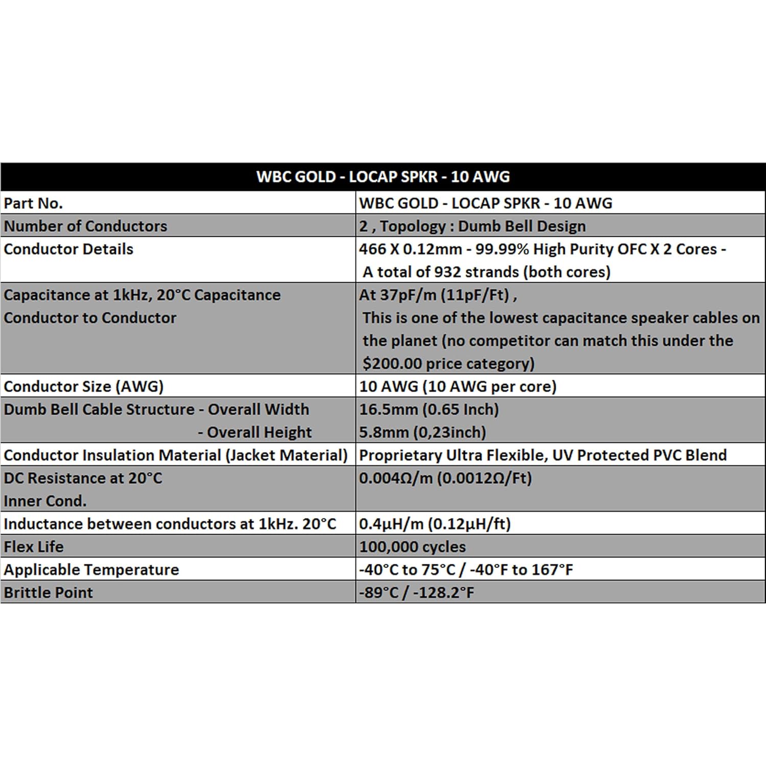 The WBC-GOLD-LOCAP-SPKR-10AWG consists of a total of 932, 99.99% Highly-Pure Oxygen Free Copper (OFC), 0.12mm fine strands divided equally between two 10AWG cores laid out in an expanded dumbbell speaker cable design. The additional distance between the 2 cores ensures probably the world’s lowest capacitance and the lowest inductance for a speaker cable in the sub $200 price range. These conductors are then covered by a proprietary PVC-blend for tough yet highly flexible outer jacket.