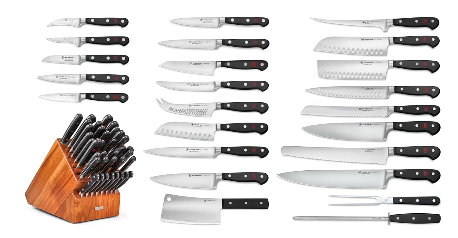 WÜSTHOF knife set – Includes 2.75″ peeling knife, 2.75″ trimming knife, 3″ serrated paring knife, 3″ straight paring knife, 3.5″ paring knife, 4″ paring knife, 4.5″ utility knife, 4.5″ cook’s knife, (8) 4.5″ steak knives, 4.75″ hard cheese knife, 5″ boning knife, 5″ tomato knife, 5″ soft cheese knife, 5″ hollow edge santoku, 6″ utility knife, 6″ cook’s knife, 6″ cleaver, 7″ fillet knife, 7″ straight meat fork, 7″ hollow edge santoku, 8″ offset deli knife.