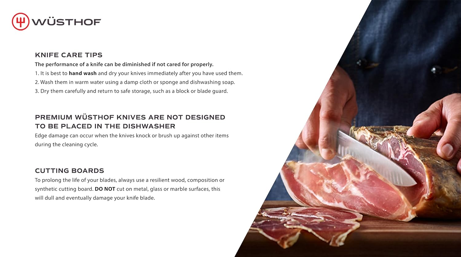 DURABLE – WÜSTHOF cutlery is crafted to resist corrosion and dulling. This German made kitchen knife set comes with a limited lifetime warranty. This set also includes: 8″ bread knife, 8″ hollow edge carving knife, 8″ cook’s.