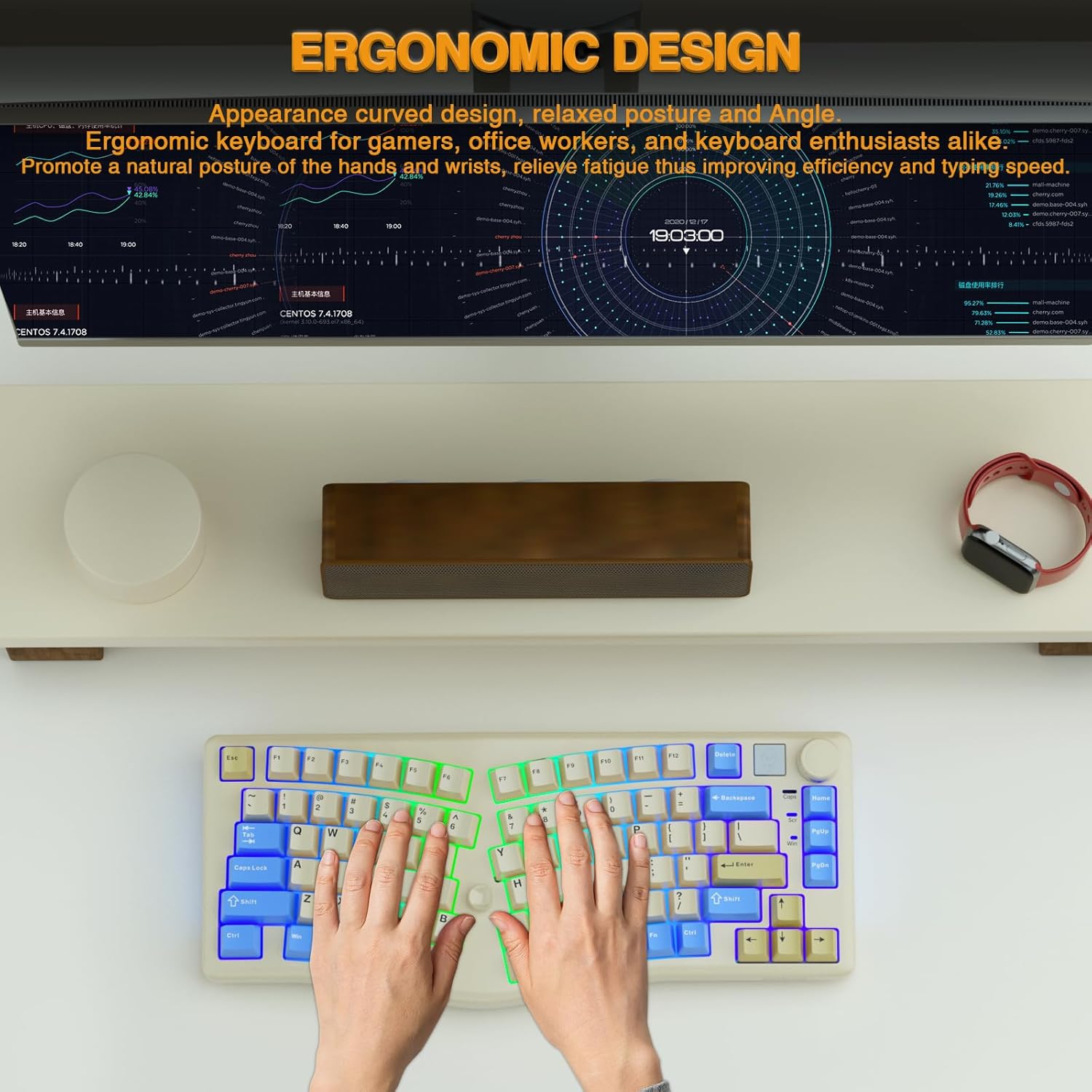 Hot Swappable RGB Backlit: This ergonomic keyboard users to personalize their typing experience through various customization options.The keyboard features hot-swappable linear switches,enabling users to easily change switches without soldering.The RGB backlighting offers 17 lighting effects and 10 music rhythm effect macro definitions, allowing users to create a visually appealing typing environment.The proprietary driver software provides further customization options, including key remapping and macro programming.Users can also define more than 16 million colors,ensuring a truly personalized and unique typing experience