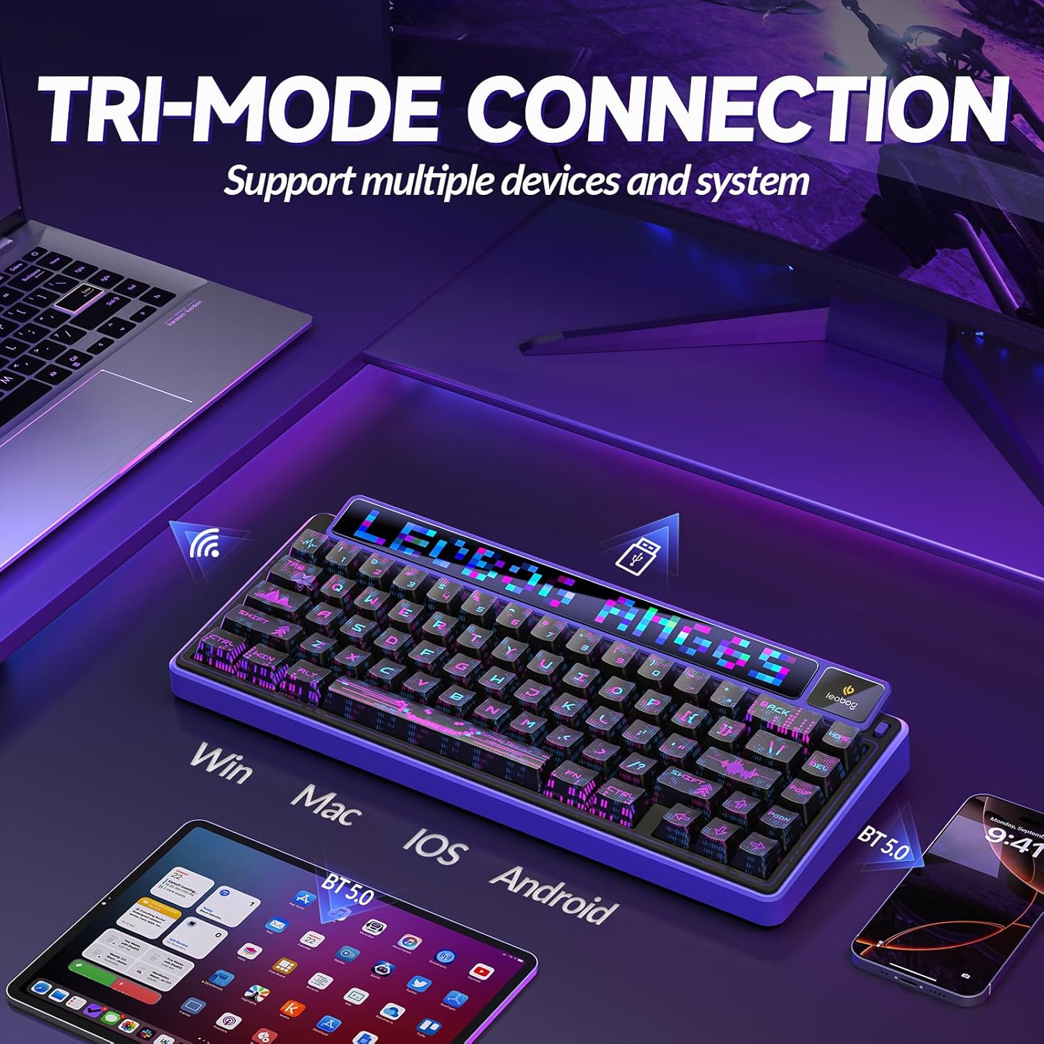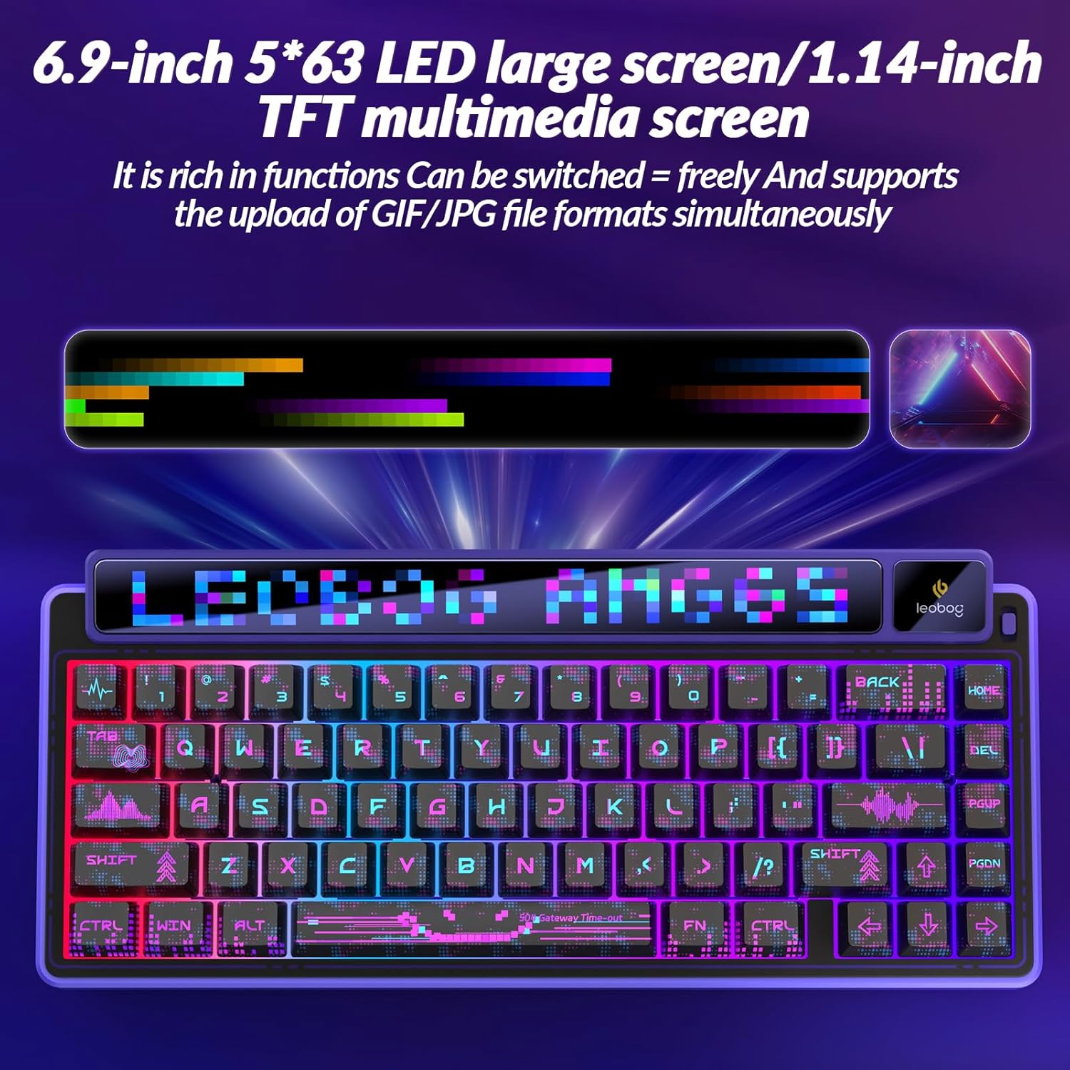 Mechanical Keyboard with 1.14-inch Smart Screen: This wireless gaming keyboard features a 1.14-inch smart display that automatically shows the date, time, connection mode, battery level, and more. It functions as a multimedia control center, allowing you to adjust keyboard lighting effects, language settings, and computer volume using shortcut keys. With robust driver support, you can even upload GIF animations to the screen, customizing the interface to create a truly personalized visual focal point for your desktop setup. Note: Need to calibrate the screen time via the driver