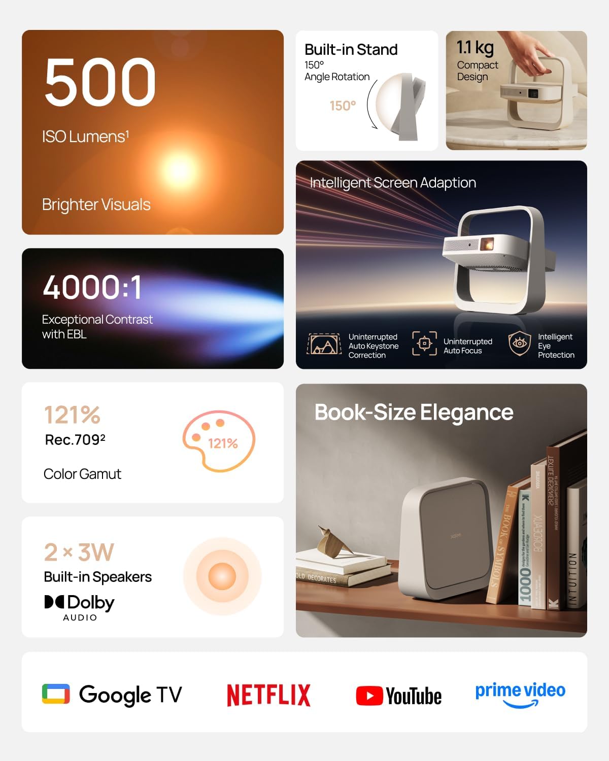 Book-Sized Movie Theater: Enjoy stunning visuals up to 200 inches and dual 3W speakers in a sleek, 2.5-inch thick design.