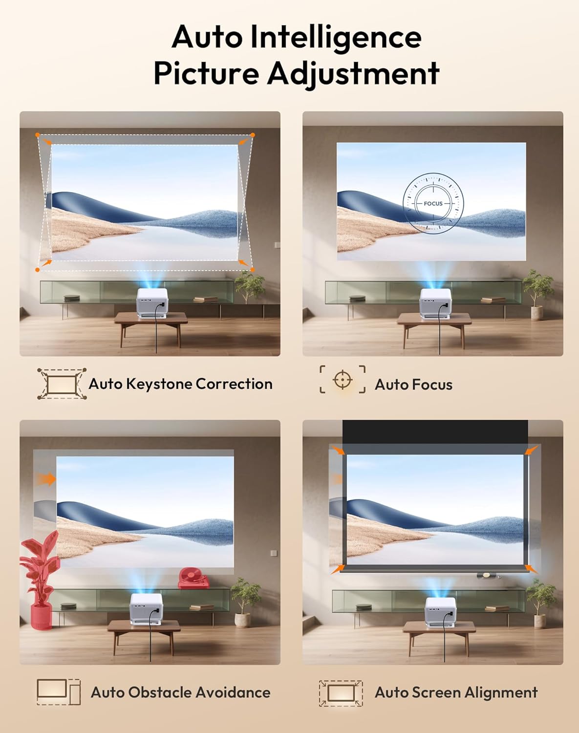 【Auto Adjusting Projection System】The home projector automatically focuses for sharp images, corrects keystone distortion, aligns with screens, and avoids obstacles – delivering pro-level convenience with zero manual adjustment.