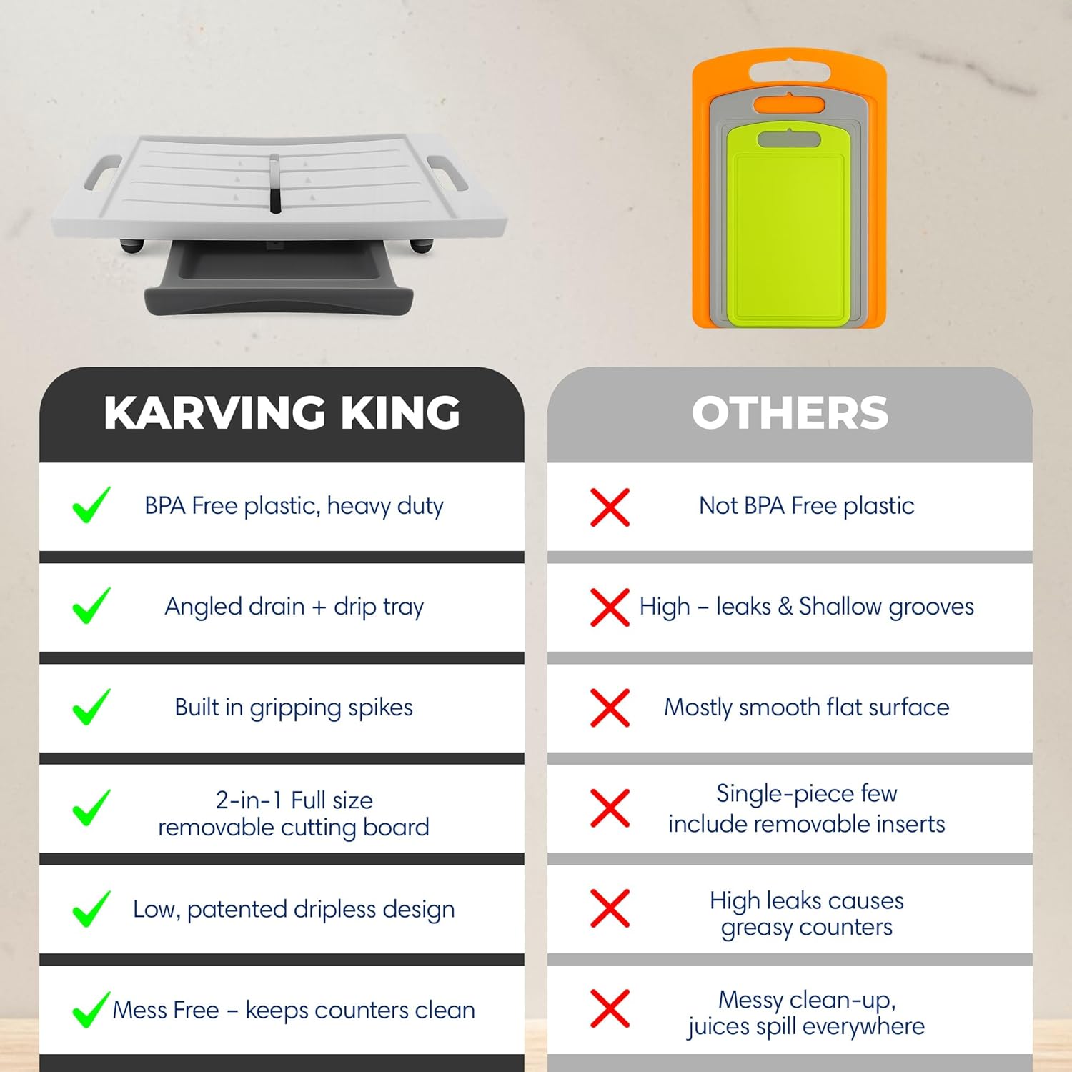 𝗣𝗿𝗼𝘂𝗱𝗹𝘆 𝗺𝗮𝗱𝗲 𝗶𝗻 𝘁𝗵𝗲 𝗨𝗦𝗔: Crafted with care in the USA, the Karving King Extra Large Carving Board is made of BPA-free, food-safe, and dishwasher-friendly material, making it perfect for everyday use. Its sleek design includes a sturdy, removable plastic cutting board for added efficiency. As with any BPA Free plastic, it will show cut marks; however, that does not impact the functionality of easy cutting or carving. The softer surface is also gentler on knives than hard materials like granite.
