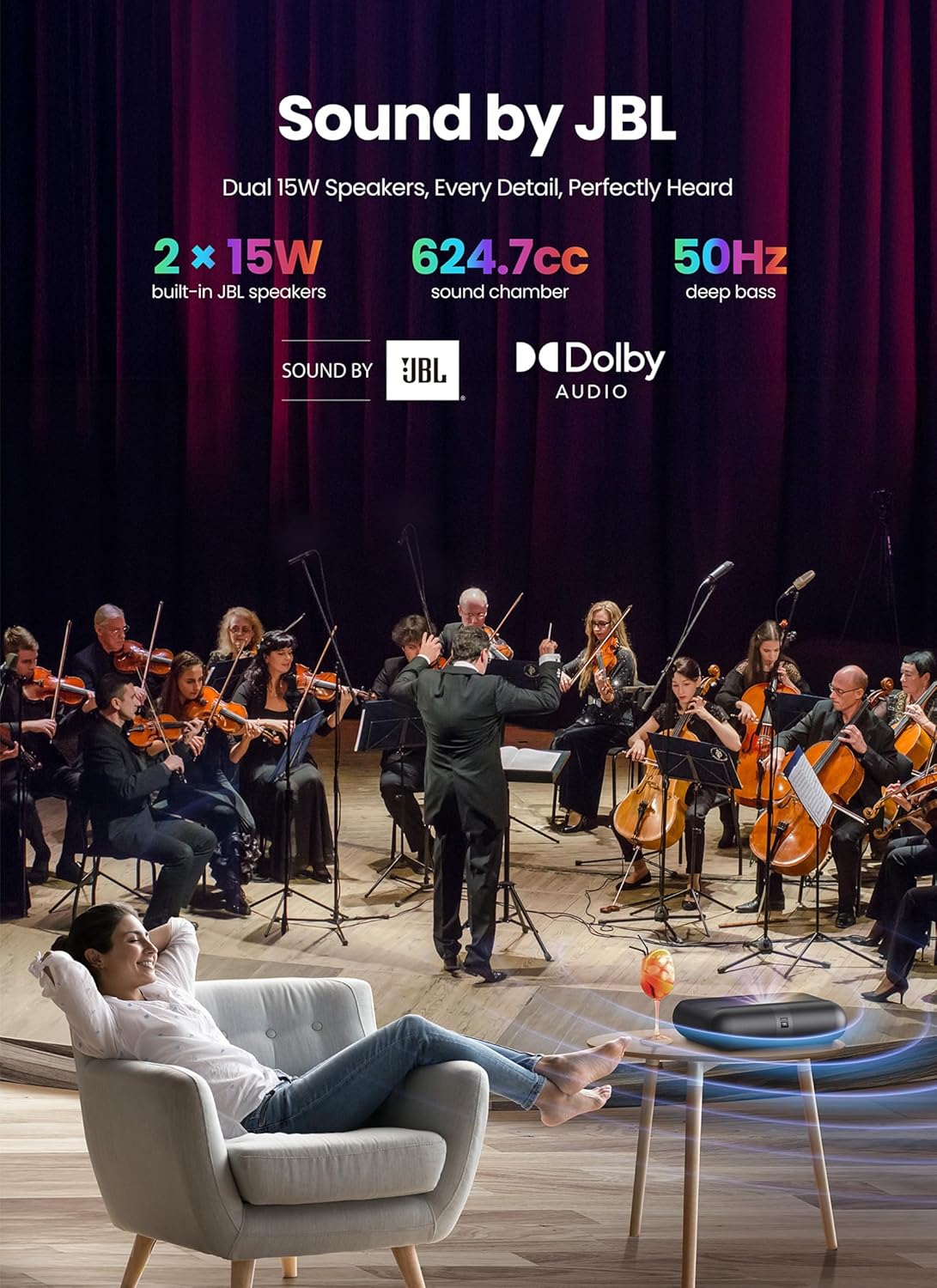 [Immersive Dolby Audio with JBL Sound] Dive into Dolby-powered 360° surround sound with dual 15W JBL speakers (total 30W output) and a large 624.7cc bass chamber that delivers deep 50Hz lows. This movie projector creates 91% louder audio than typical TVs, capturing subtle sounds like rainfall and footsteps with clarity. It’s an all-in-one home theater audio solution that saves you from buying a separate soundbar