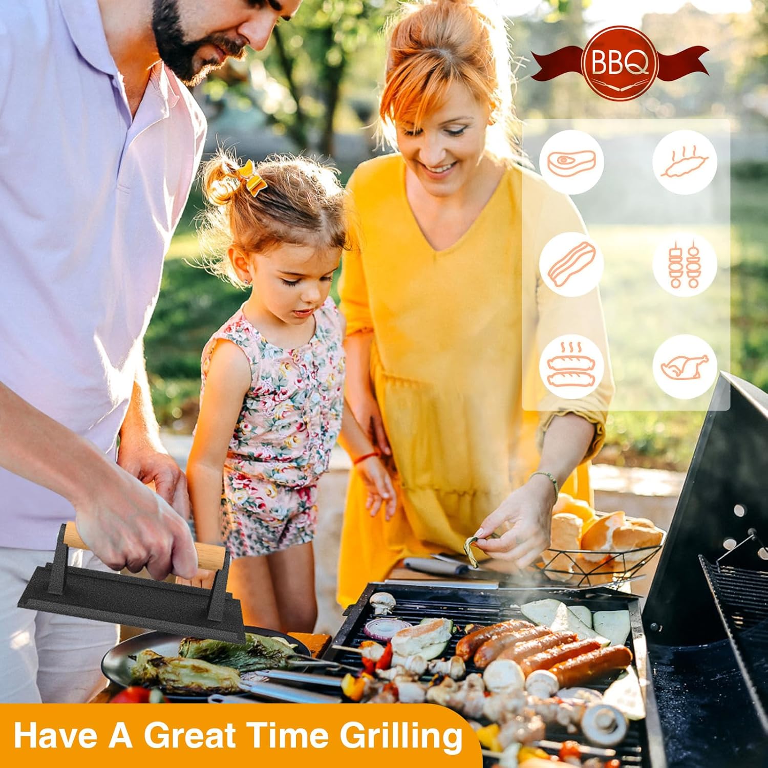 Convenient Operation And Effortless Maintenance: Our rectangular burger press is compatible with a wide range of skillets,pans,grills,and grill pans.Furthermore,our meat press for the griddle is designed for easy and rapid cleaning,ensuring a hassle-free experience.This cast iron griddle press is the perfect gift choice for your parents,husband,wife,and loved ones.