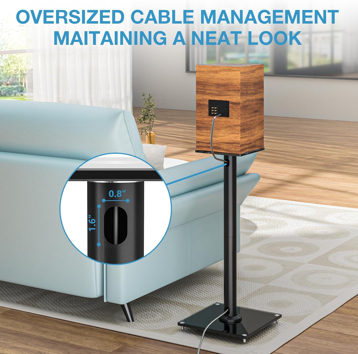 ✔️ Cable Management: 27 inch pole has two large holes (1.6″ H x 0.8″ W) for easy cable threading and cable to be neatly hidden, keeping your speakers tidy. The low base design of the rear speaker stands make it a great space saver. It can be perfectly placed on the side of a cabinet or sofa for flexible placement, does not suck up a ton of space.