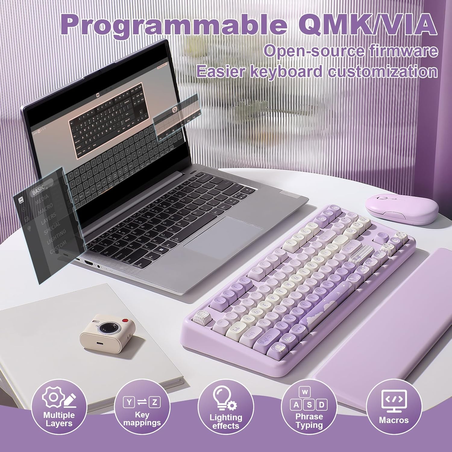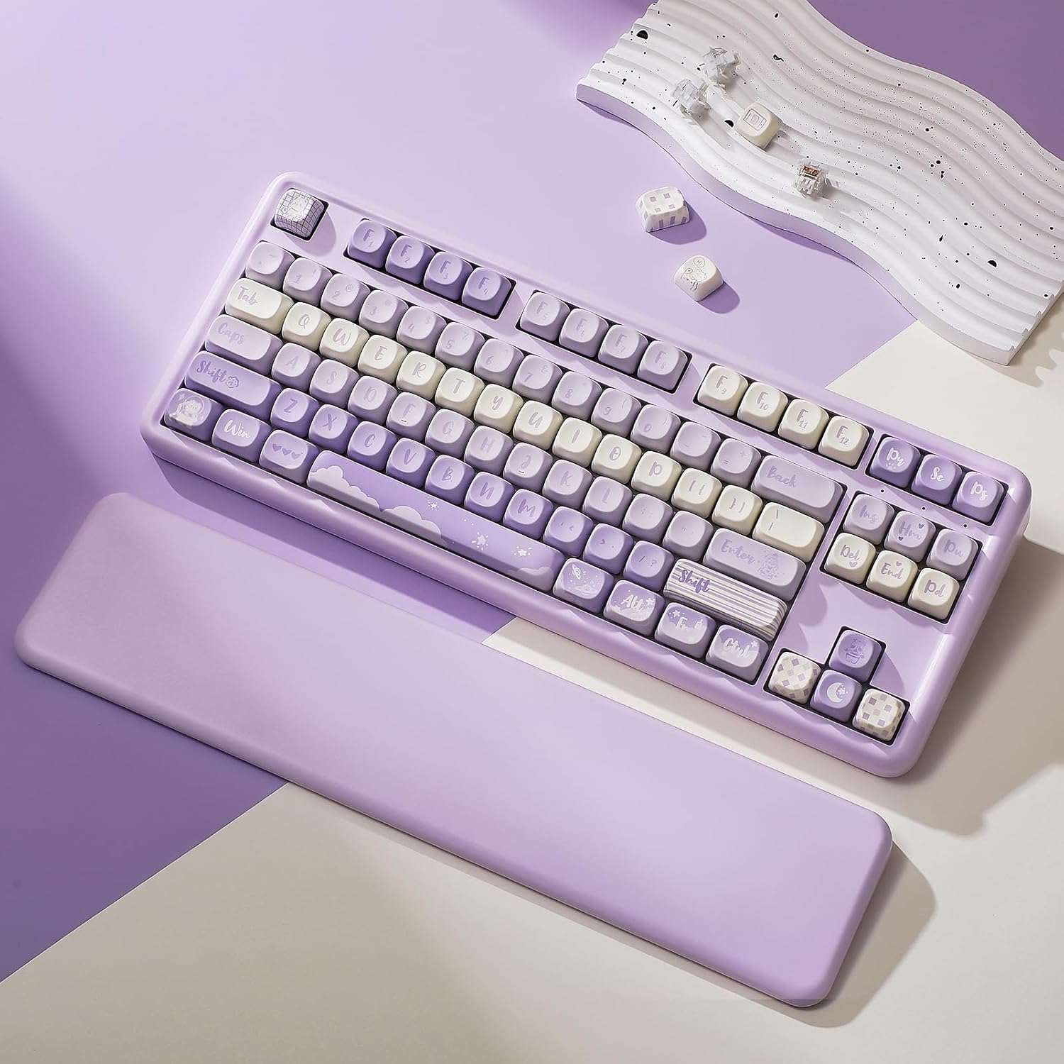 Mechanical Keyboard 87 Key with Wrist Rest Combo: As a compact TKL keyboard, B87 boasts a unique, cute aesthetic perfect for present or everyday use. Its cute dye sub PBT keycaps and aesthetic color makes it a centerpiece on any desk. The RGB 87 keys gaming keyboard come with a ergonomic wrist rest, which is made from premium skin-friendly ABS material, ensuring durability while offering a smooth and comfortable use