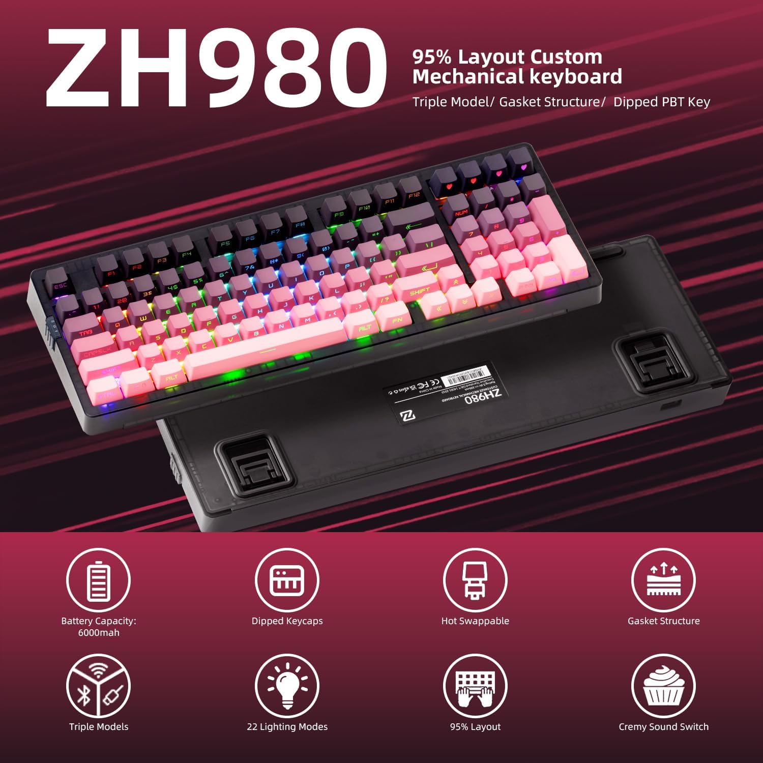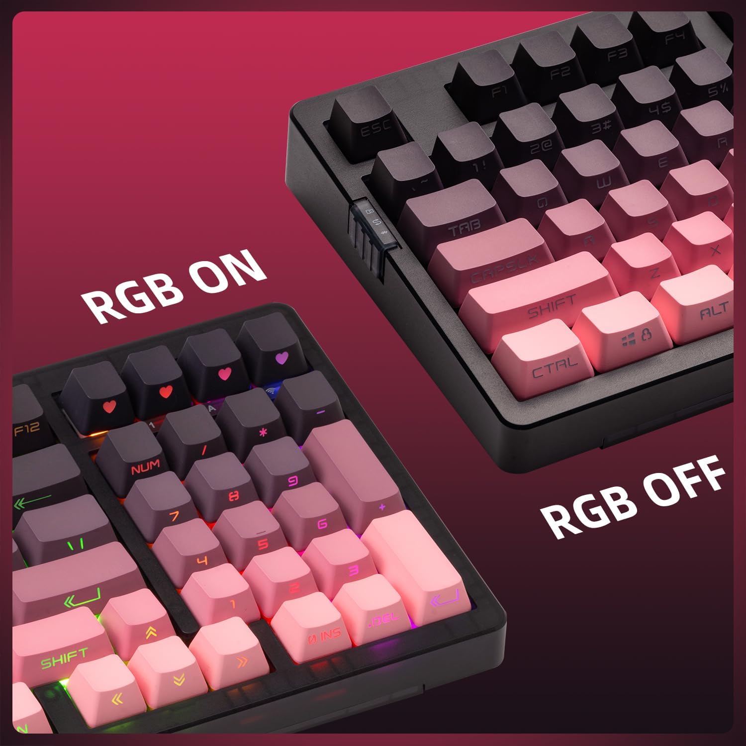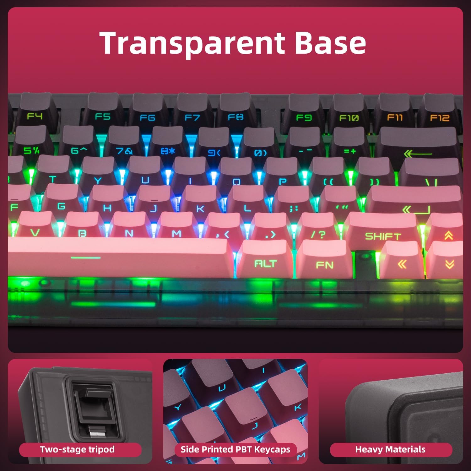 【Dipped PBT Keycaps with Clear Legends】Crafted from high-purity PBT with Dipped technology, the keycaps resist shine and wear while featuring a pink gradient theme that glows with RGB. Side-printed, molded legends ensure long-term clarity and smooth light diffusion.