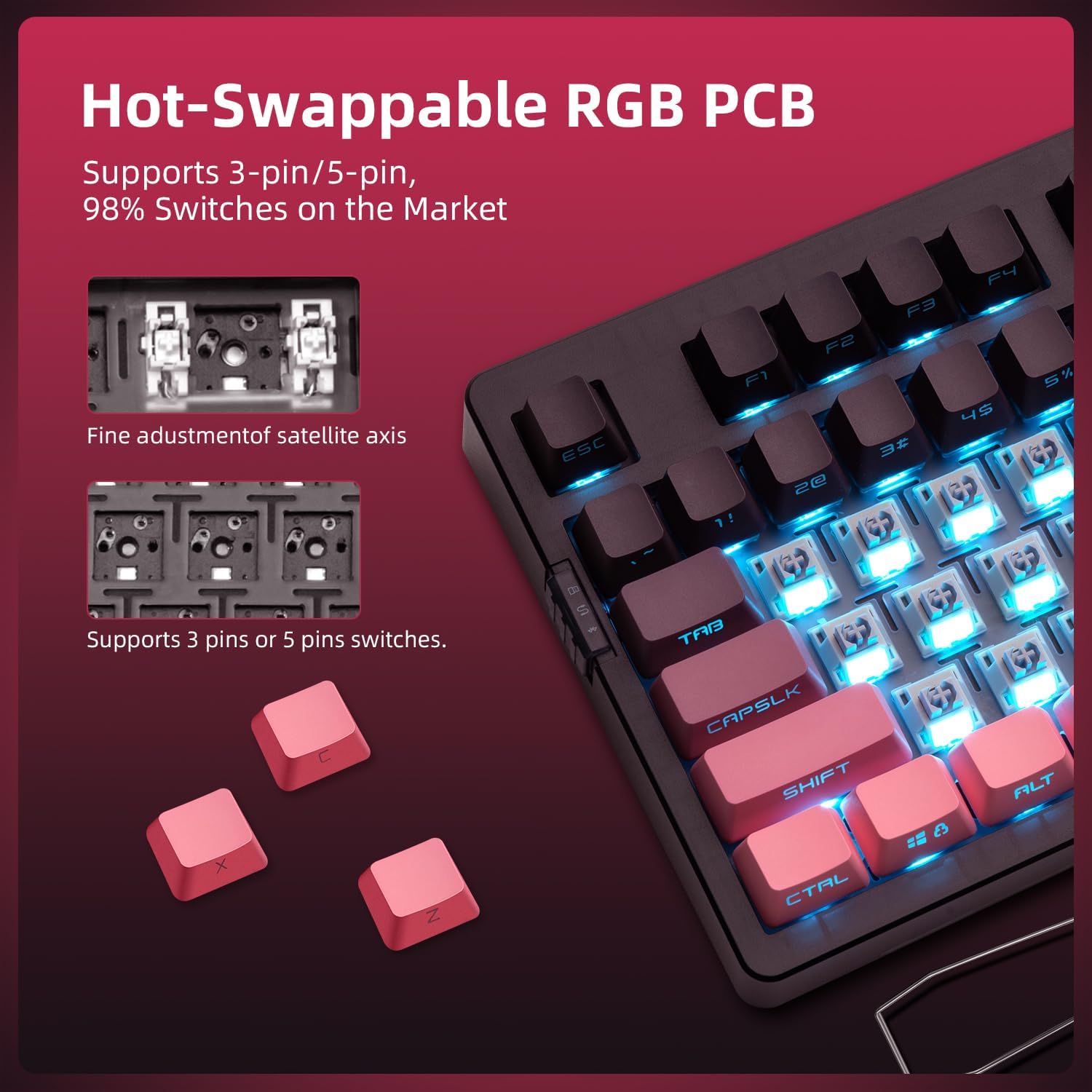 【Hot-Swappable & Fully Customizable】Compatible with both 3-pin and 5-pin mechanical switches, no soldering needed. With driver support, remap keys, set macros, and personalize lighting modes to fit your gaming or workflow style