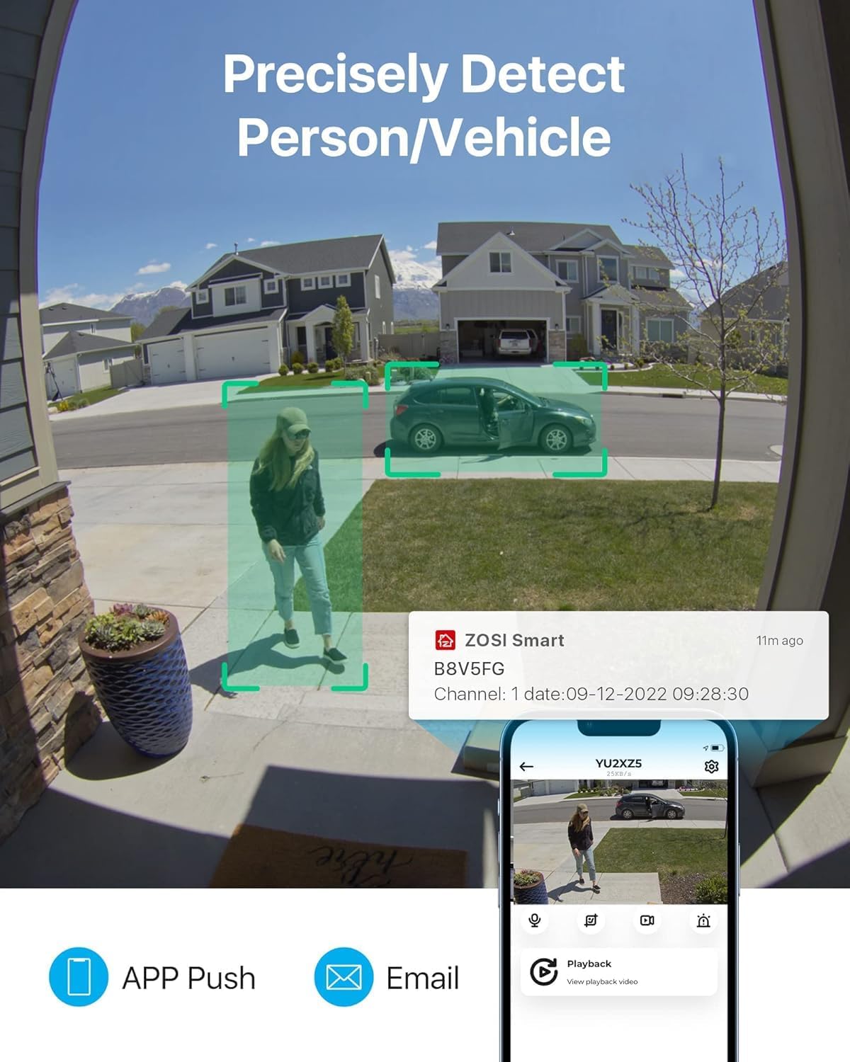 【AI-Powered Human & Vehicle Detection】Advanced AI algorithms accurately distinguish between people, vehicles, and other objects, reducing false alerts. Receive instant mobile notifications and email alerts for motion detection.