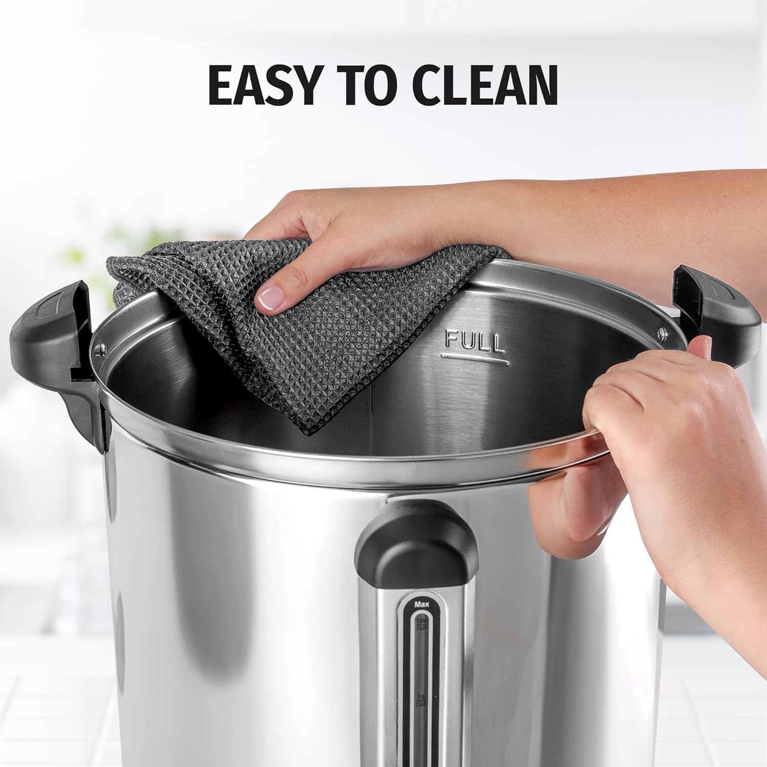 A CERTIFIED CROWD PLEASER: With this commercial coffee maker, serving a quick, freshly brewed coffee for a meeting or large gatherings was made easy. This industrial coffee maker is a heavy-duty hot water urn that is made of stainless steel and has a concealed heating element system that keeps the water insulated for a very long time. This percolator coffee pot has a two-way easy pour faucet that allows a single cup or continuous pouring.
