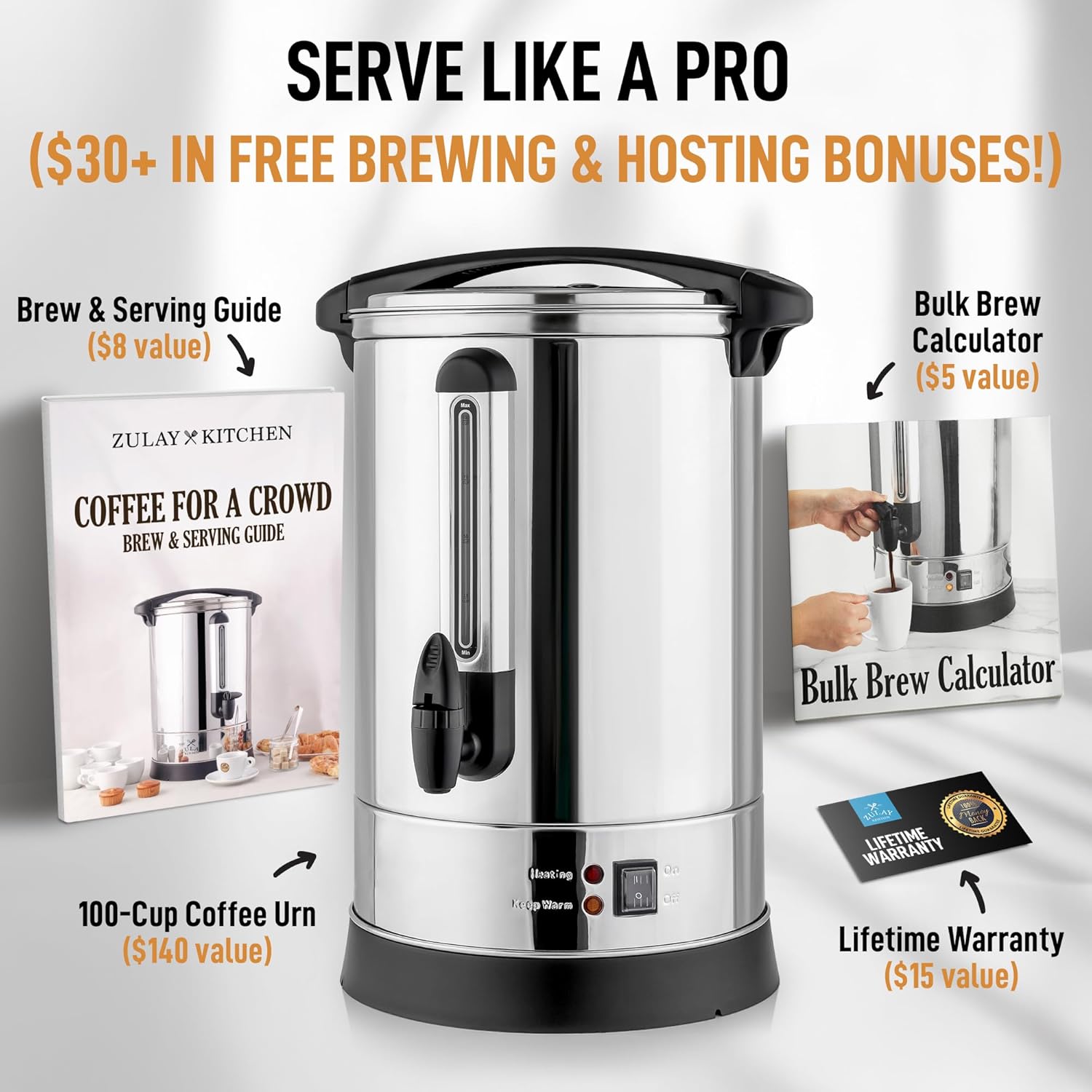 Zulay Kitchen Commercial Grade Coffee Maker Hot Water Urn – Percolator With Double-Wall Stainless Steel, Quick Brew, Stays Hot for Tea & Beverage at Events & Catering – Serves 100 Cups – Silver
